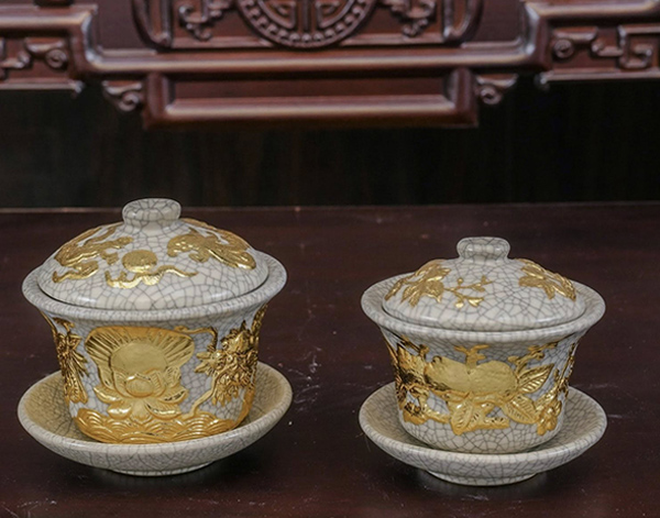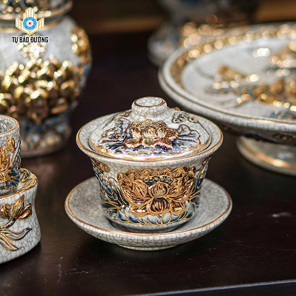Sự kết hợp giữa men rạn và họa tiết vẽ vàng tạo nên dòng bát sâm sang trọng, quý phái. Những đường nét vẽ vàng lấp lánh được thực hiện thủ công bằng vàng thật, tạo điểm nhấn đắt giá cho không gian thờ cúng. Đây là lựa chọn lý tưởng cho những gia chủ muốn nâng tầm sự trang nghiêm trên bàn thờ gia tiên, đặc biệt phù hợp với các bộ đồ thờ men rạn cao cấp.